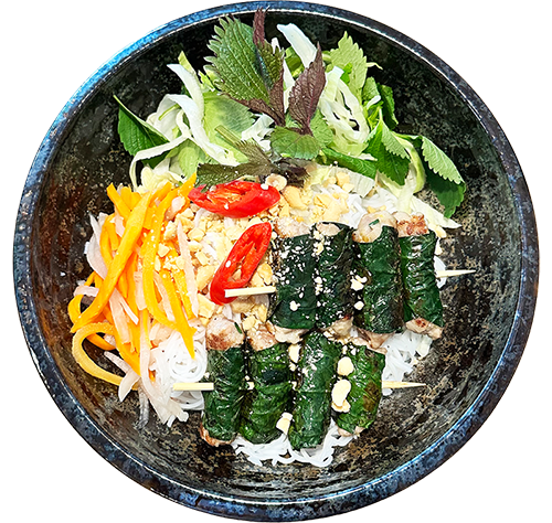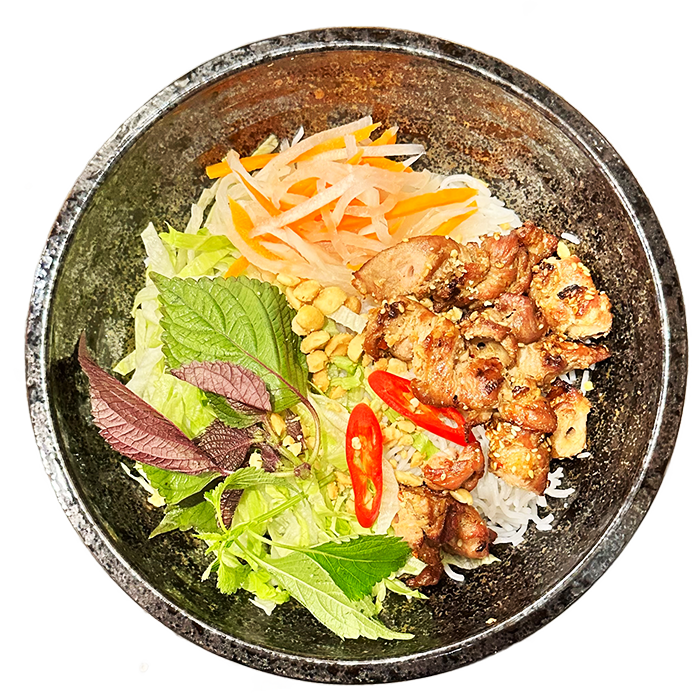 Mariniertem und gegrilltem Schweinefleisch, mit Reisnudeln, frischen Salat, vietnamesische Kräutern und Limetten-Fichsauce serviert.